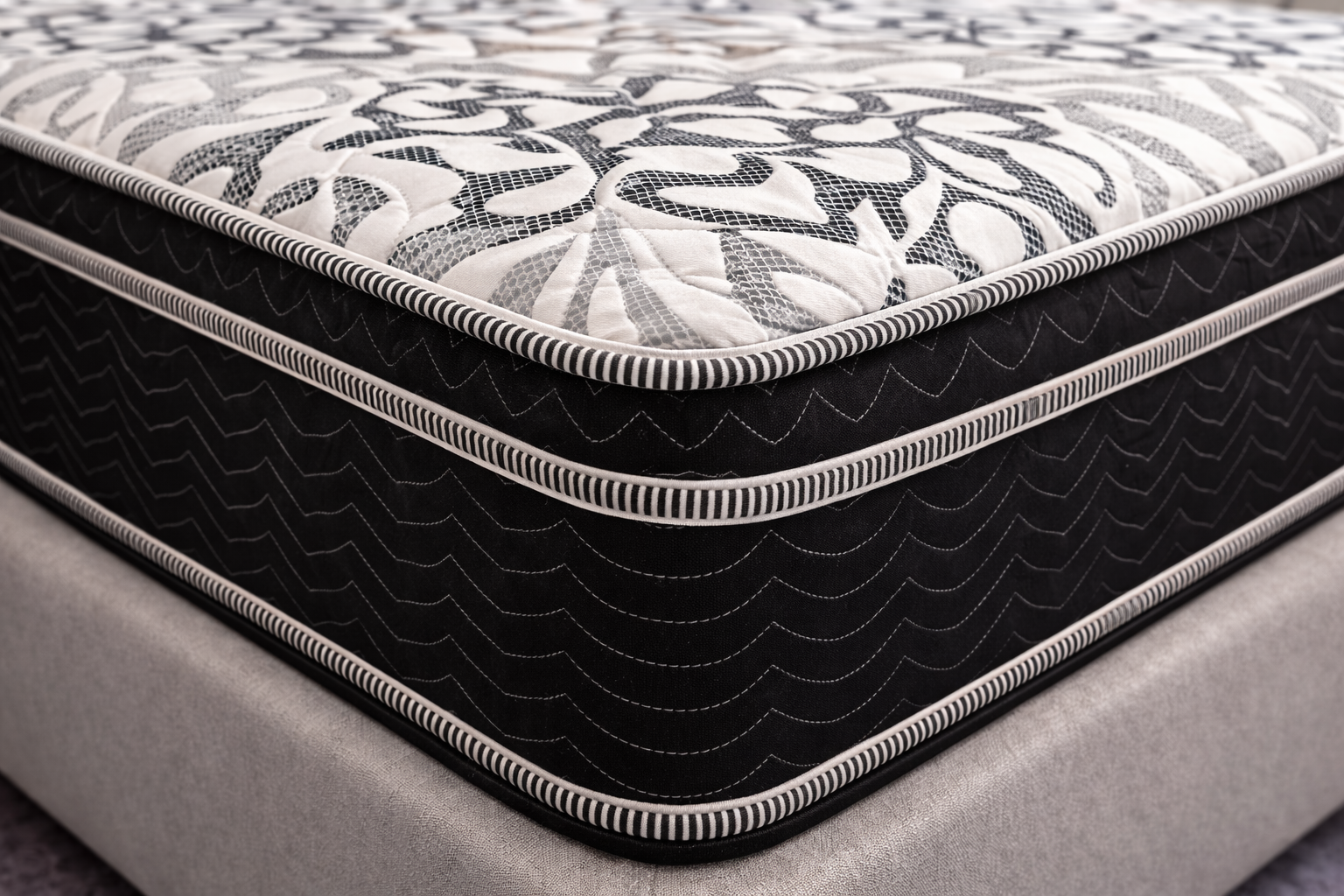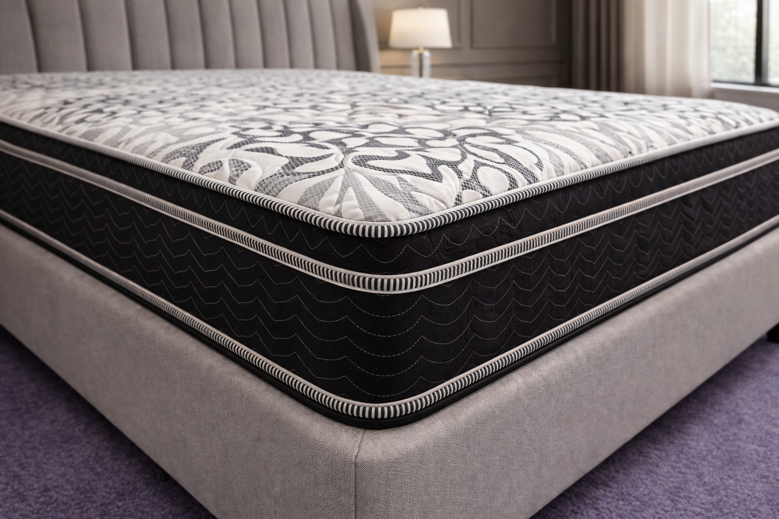 Visually, Luster has a sharper and more tailored presence than a standard premium mattress. The patterned top, dark side panels, layered edge design, and striped piping give it a more polished look that feels intentional and refined from every angle. That same visual structure carries into the sleep experience, creating a mattress that feels supportive, stable, and distinctly premium night after night.