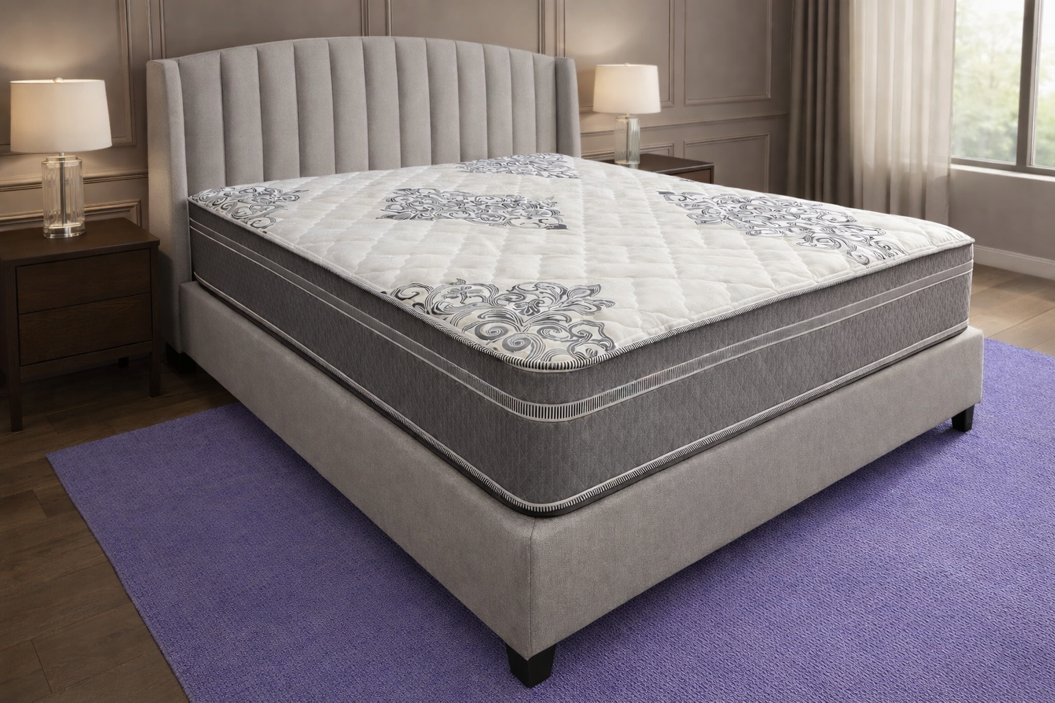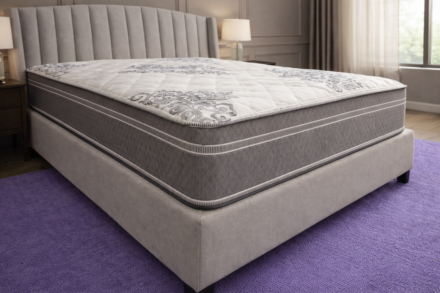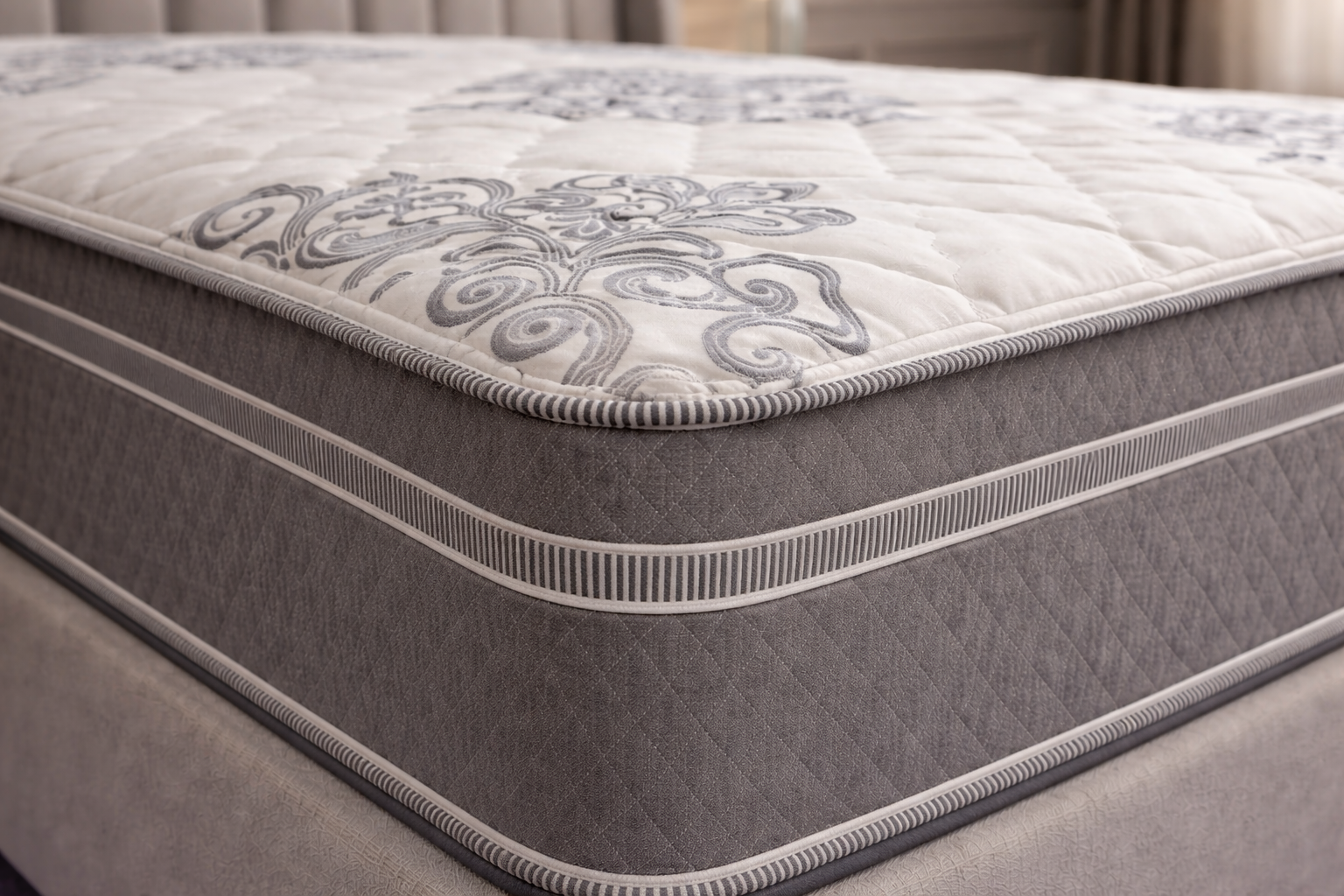 Visually, Sanctuary has a classic and quietly polished presence. The quilted white top, decorative stitched pattern, textured gray side panels, and striped piping give it a more tailored look that feels supportive, finished, and intentionally refined. That same visual balance carries into the sleep experience, creating a mattress that feels welcoming and comfortable without looking or feeling overly plush.